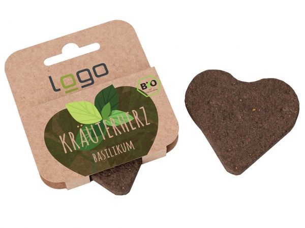 Ein Herz für Kräuter: Es war selten so einfach, eigene Kräuter auf der Fensterbank oder im Garten zu ziehen! Das Kräuterherz besteht aus einer sorgfältig zusammengestellten Mischung aus nährstoffreicher Pflanzerde, natürlichem Lehmpulver und hochwertigem kontrolliert biologischem Saatgut. Die klassischen Küchenkräuter setzen kulinarische Akzente – setzen Sie mit diesem Werbeartikel nachhaltige Akzente! Das Kräuterherz muss nur auf Erde gelegt und bewässert werden. Einfacher geht es nicht. Zur Auswahl stehen Petersilie, Schnittlauch, Basilikum und Dill. Individualisieren Sie die Kartonverpackung mit Ihrem Logo! Max. Druckfläche: 55 x 60 mm.